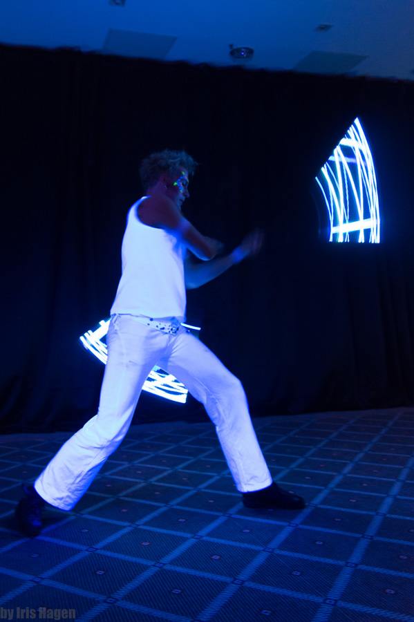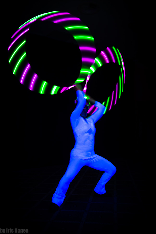 Aus dem geheimnisvollen Dunkeln tanzen leuchtende, weiße und farbige Formen kunstvoll durch den Raum. Mal verspielt, mal dynamisch werden eindrucksvolle, schwarzlichtaktive, LED und andere Lichtspielgeräte fantasievoll in Bewegung gebracht.